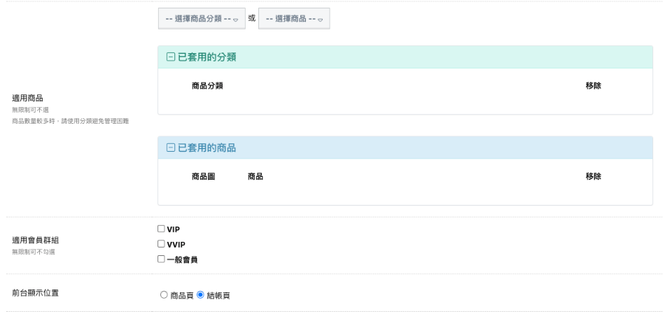 ☞ 適用會員群組 會顯示您商店目前所有會員群組,設定「全館」活動則不需特別勾選