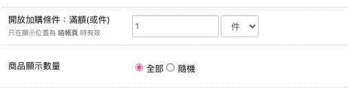 1. 選擇⦿結帳頁 才會出現,『滿額或滿件』的條件設定欄位。