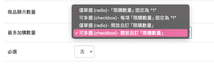 ☞ 最多加購數量 依照您贈品活動「是否必選」來設定