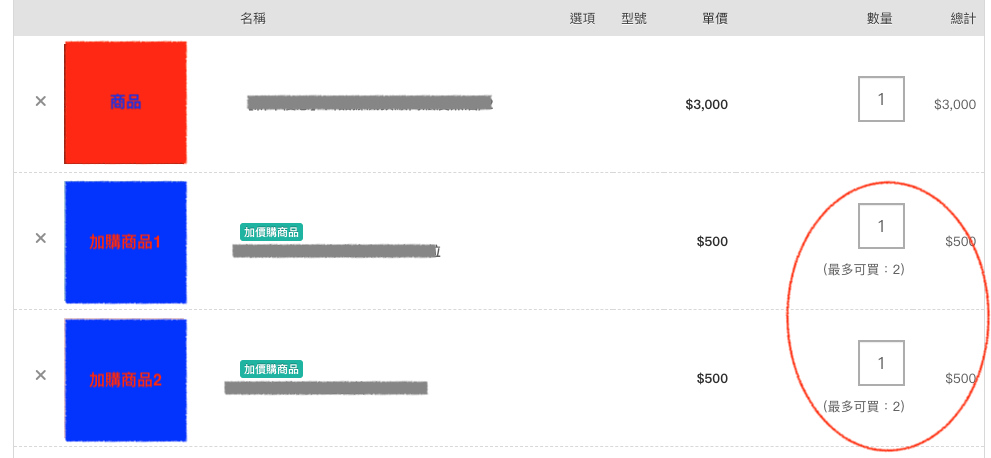 1. 若設定前台顯示在「商品頁」,設定了「僅單選(radio),開放自訂「限購數量」」及「可多選(checkbox),開放自訂「限購數量」」,需要在「商品頁」先選擇要加購的商品,「數量」部分,會在「購物車」頁面中,調整要加購的數量。