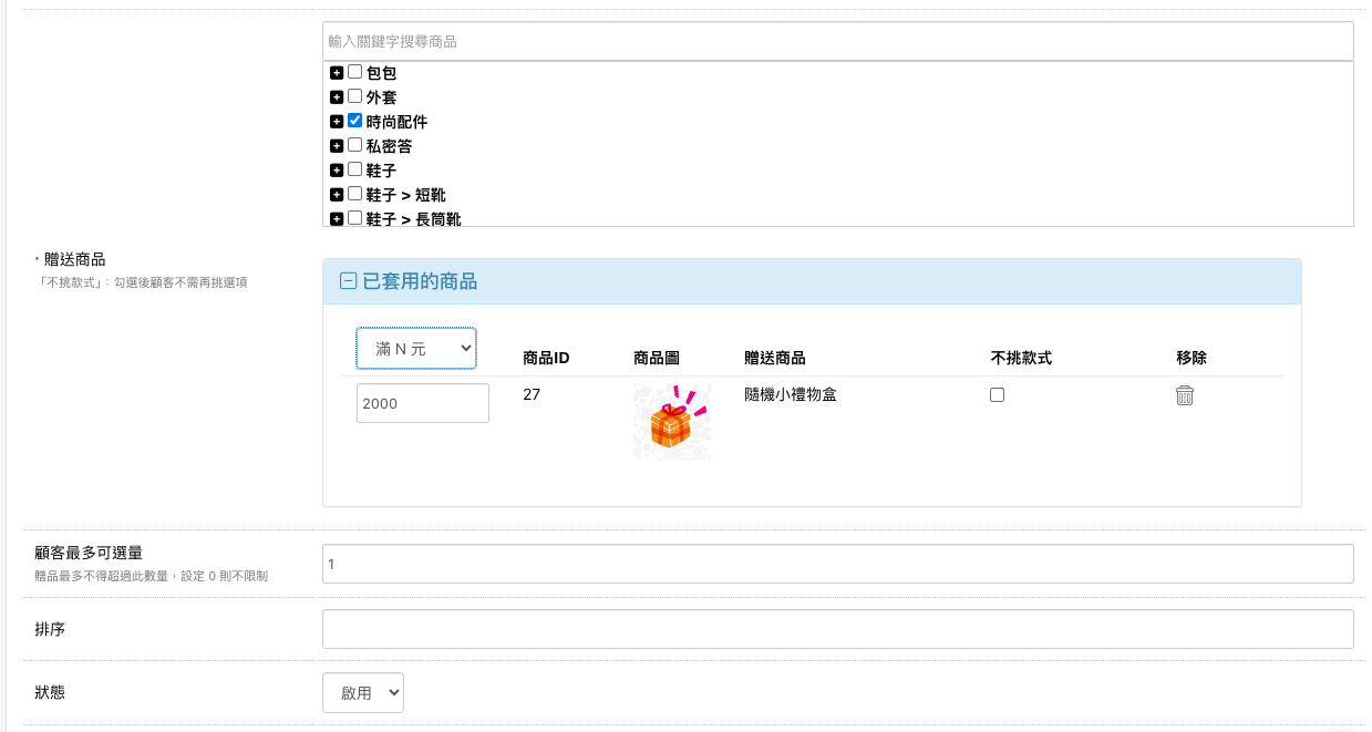 2. 設定了「僅單選(radio),開放自訂「限購數量」」及「可多選(checkbox),開放自訂「限購數量」」,「贈送商品」的右側,會顯示「」。