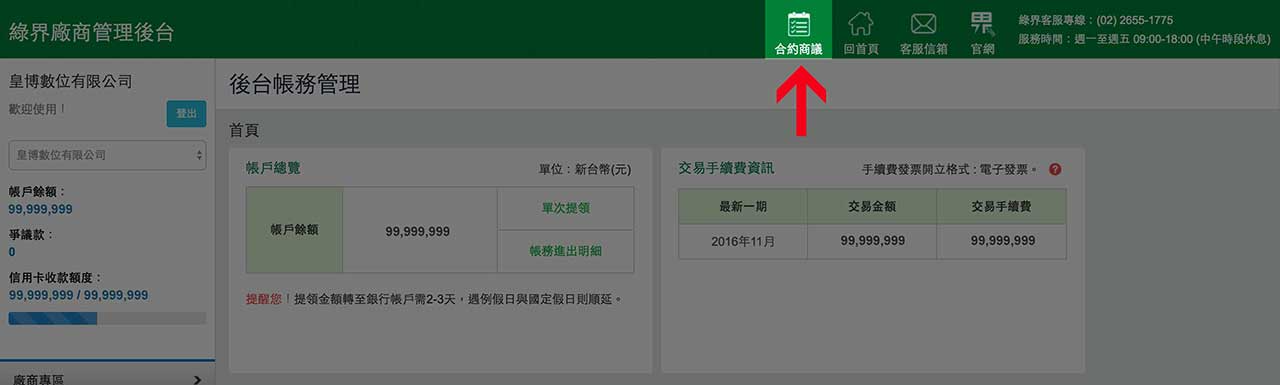 STEP2. 進入管理後台後,請至下方位置所示連結進行「合約商議」動作