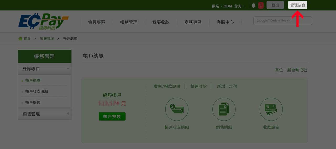 STEP1. 請先登入綠界官網(ecpay.com.tw) 至上方選單進入「管理後台」