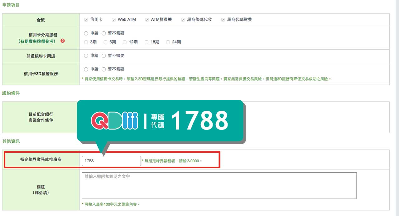 STEP4. 請務必在「指定綠界業務或推廣商」欄位中填入QDM商家專屬代碼 1788