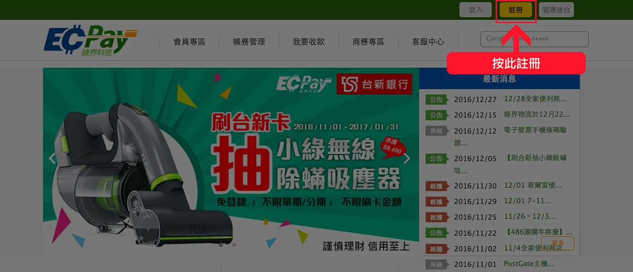 如果您未註冊過綠界會員,至綠界官網(ecpay.com.tw) 如下圖所示連結進行註冊