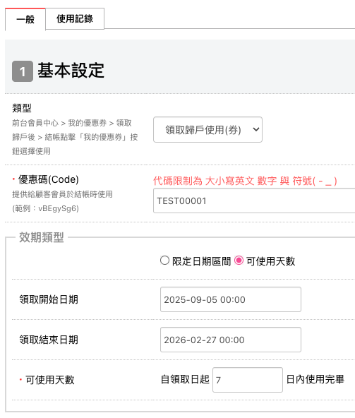 ▲ 設定「可使用天數」:會員需要到前台會員中心,領取優惠券。