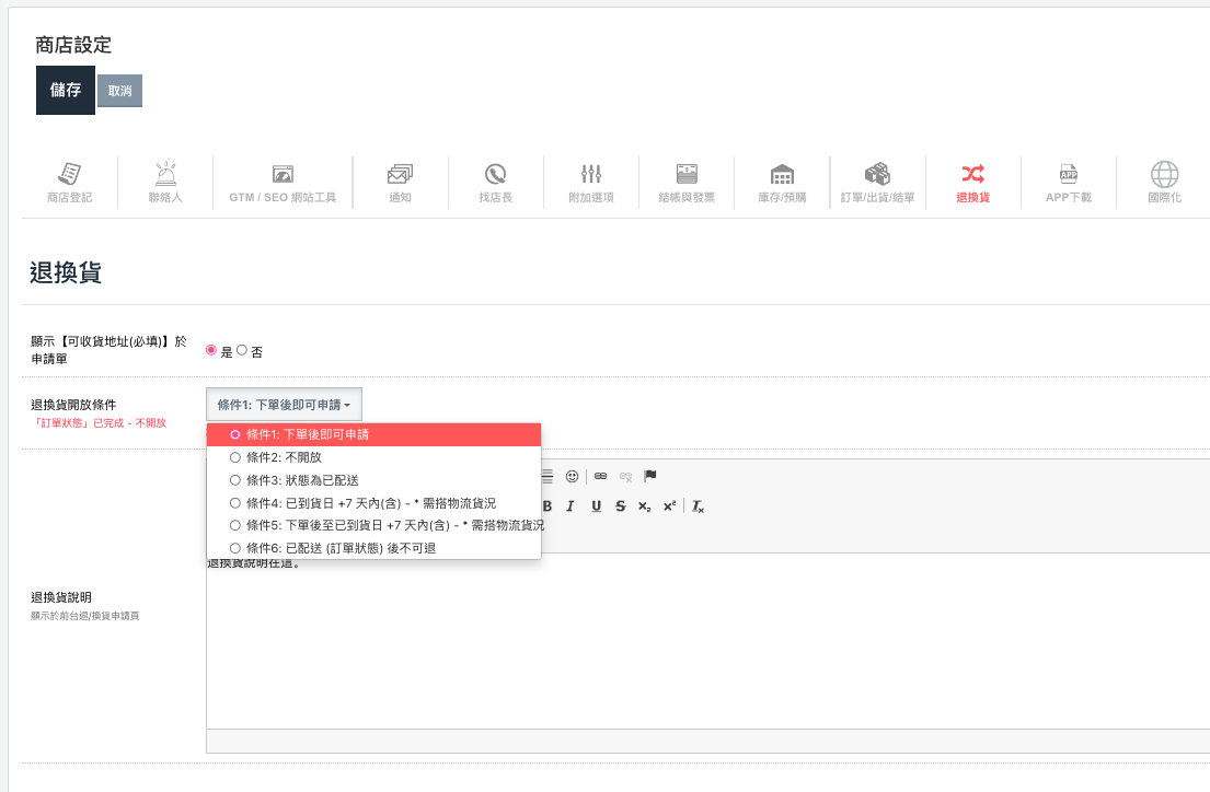 一、開放「退換貨」需先設定「退換貨開放條件」