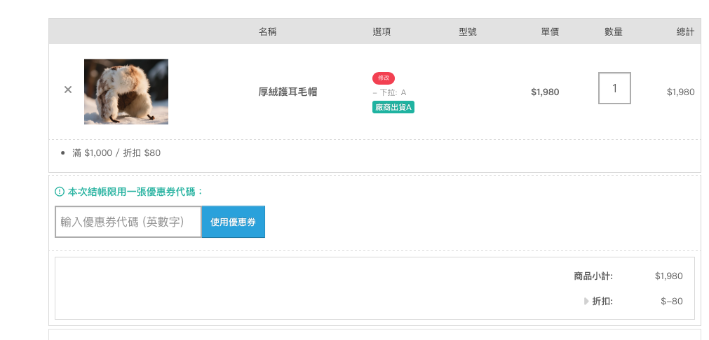 3)免運條件計算方式:商品小計1980元-全館折扣80元