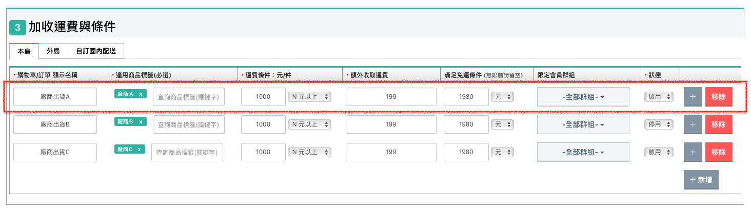 ③ 運費加收條件 - 設定依據不同出貨廠商,並可依據本島/外島設定。