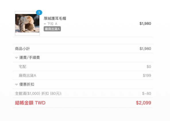 4)商品小計1980元-全館折扣80元=1900元,未達到免運門檻,故會加收199元。