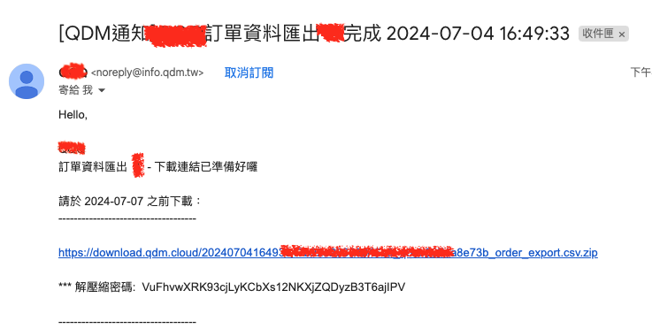 ④ 管理員信箱收到的匯出完成信件中,會有下載匯出報表的連結,點擊後儲存。