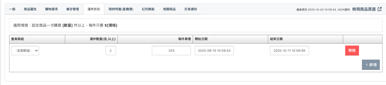設定路徑:商品 > 上架商品 > 編輯 > 滿件折扣。