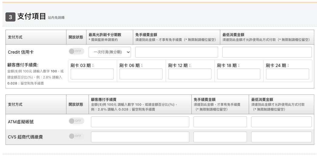 將要開放使用的支付方式「開啟」,再設定「條件」。