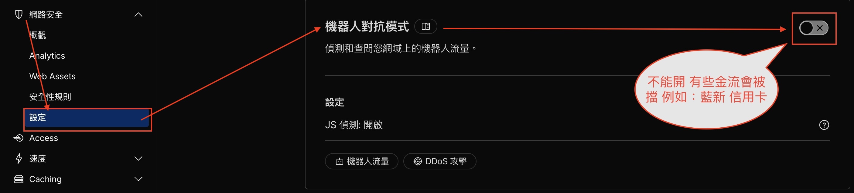 cloudflare機器人對抗模式,得關閉或升級,才能自訂規則排除金流及物流。