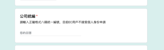申請表中的「公司統編」欄位,格式必須為:1QDM_統編.EC.NEW。