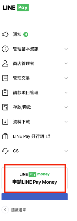 步驟2. 進入後台後點擊右下角 『申請LINE Pay Money服務』進行申請