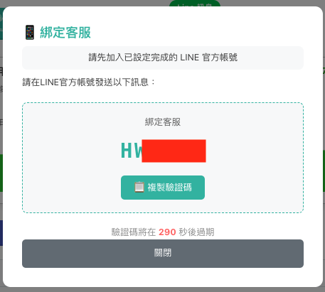 - 點擊後會顯示一組驗證碼,複製後,在LINE官方帳號發送訊息,內容為您複製的驗證碼