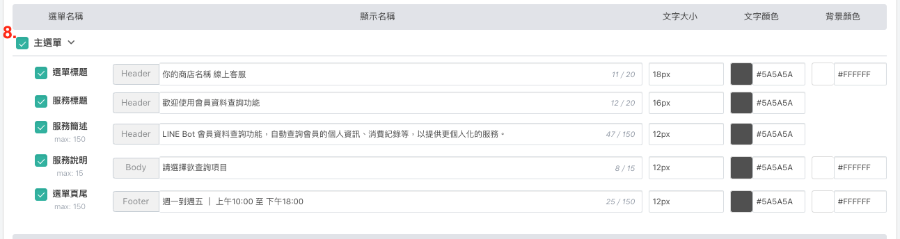 服務說明 / 顯示名稱、文字大小、文字顏色、背景顏色