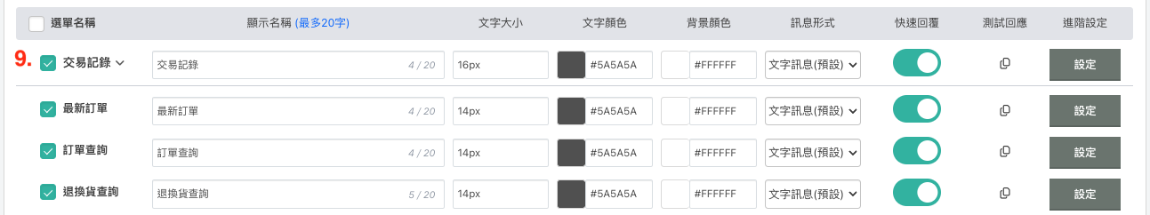 訂單查詢 / 顯示名稱、文字大小、文字顏色、背景顏色、訊息形式、是否快速回應