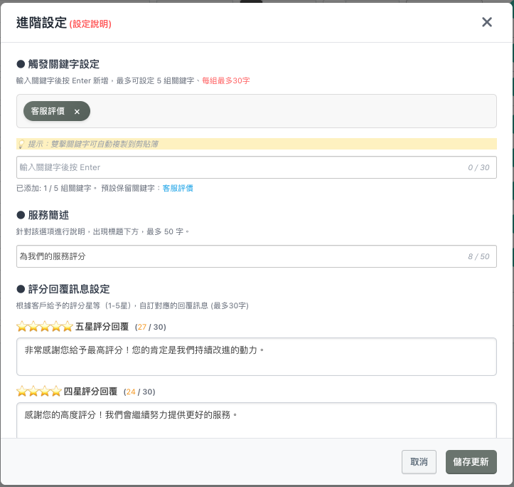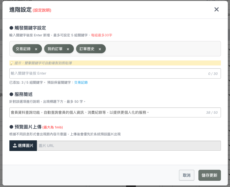 「觸發關鍵字(最多5組)」、「服務簡述」、「預覽圖片上傳(1M為限)」