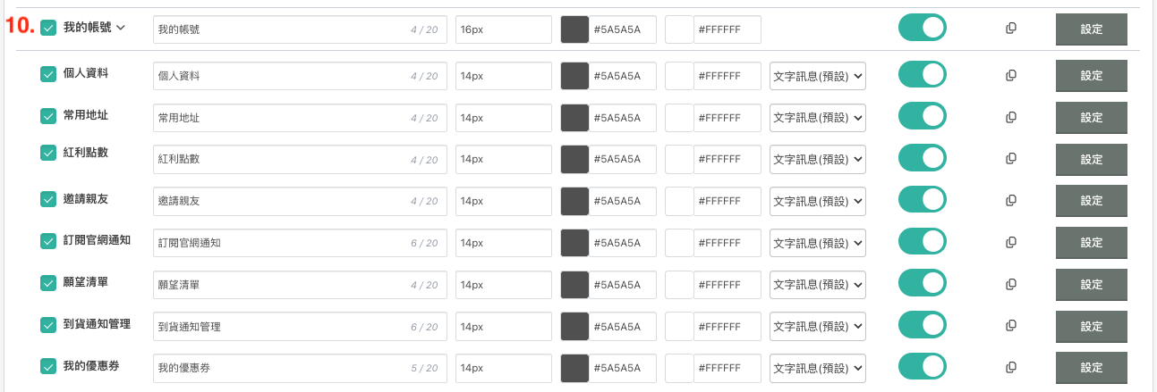 我的優惠券 / 顯示名稱、文字大小、文字顏色、背景顏色、訊息形式、是否快速回應