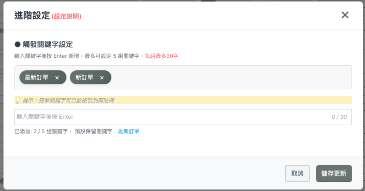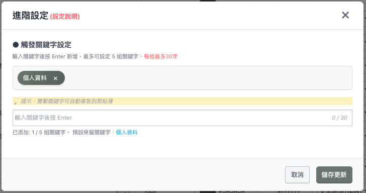 - 子選單點右側「編輯」可以設定:「觸發關鍵字」