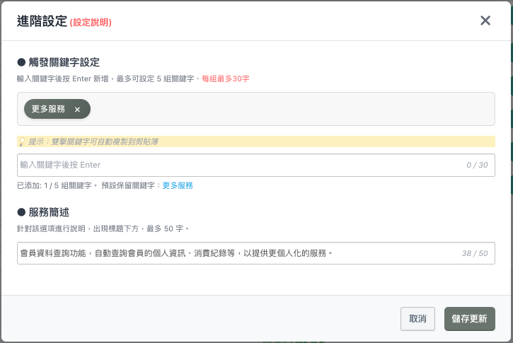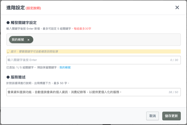 - 右側「編輯」可以設定:「觸發關鍵字(最多5組)」、「服務簡述」
