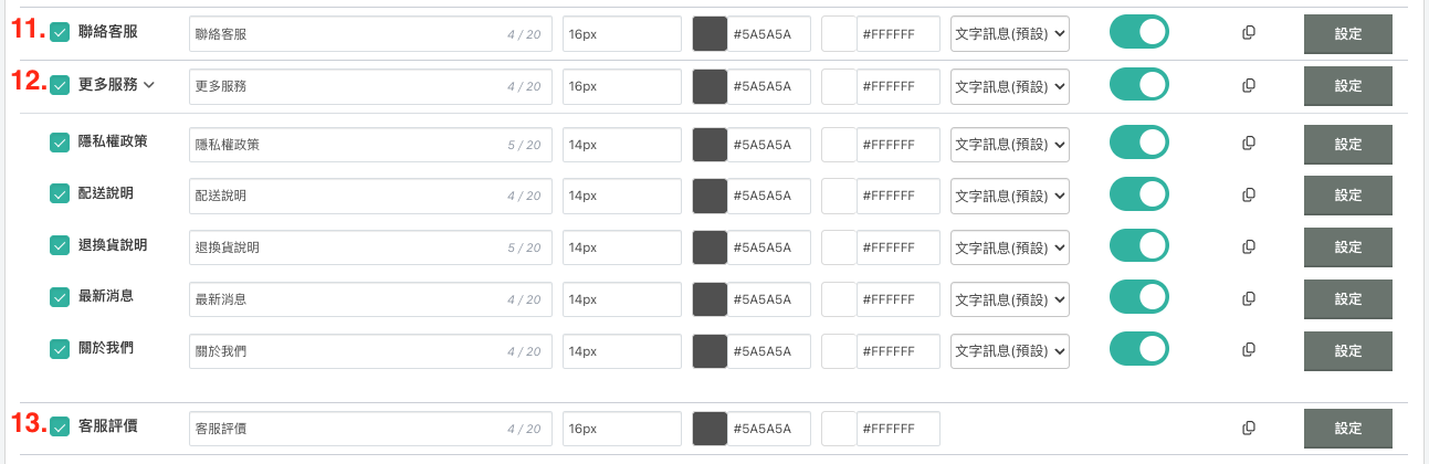 選單頁尾 / 顯示名稱、文字大小、文字顏色、背景顏色
