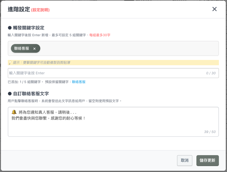 - 右側「編輯」可以設定:「觸發關鍵字(最多5組)」、「自訂聯絡客服文字」