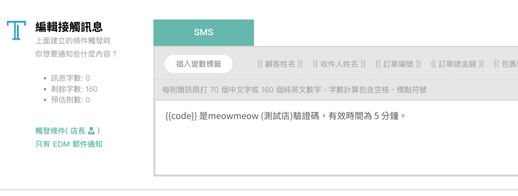 可以自訂發送驗證碼的訊息內容,訊息中請務必加上變數標籤 {{code}}